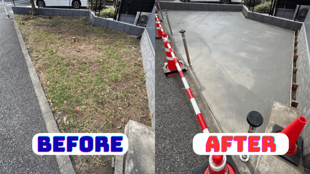 「もう草むしりはしたくない!」というご希望に対し、最も効果的なのは地面を覆ってしまうことです。 今回は、駐車スペースとしても使えるように「土間コンクリート」の施工を行いました。